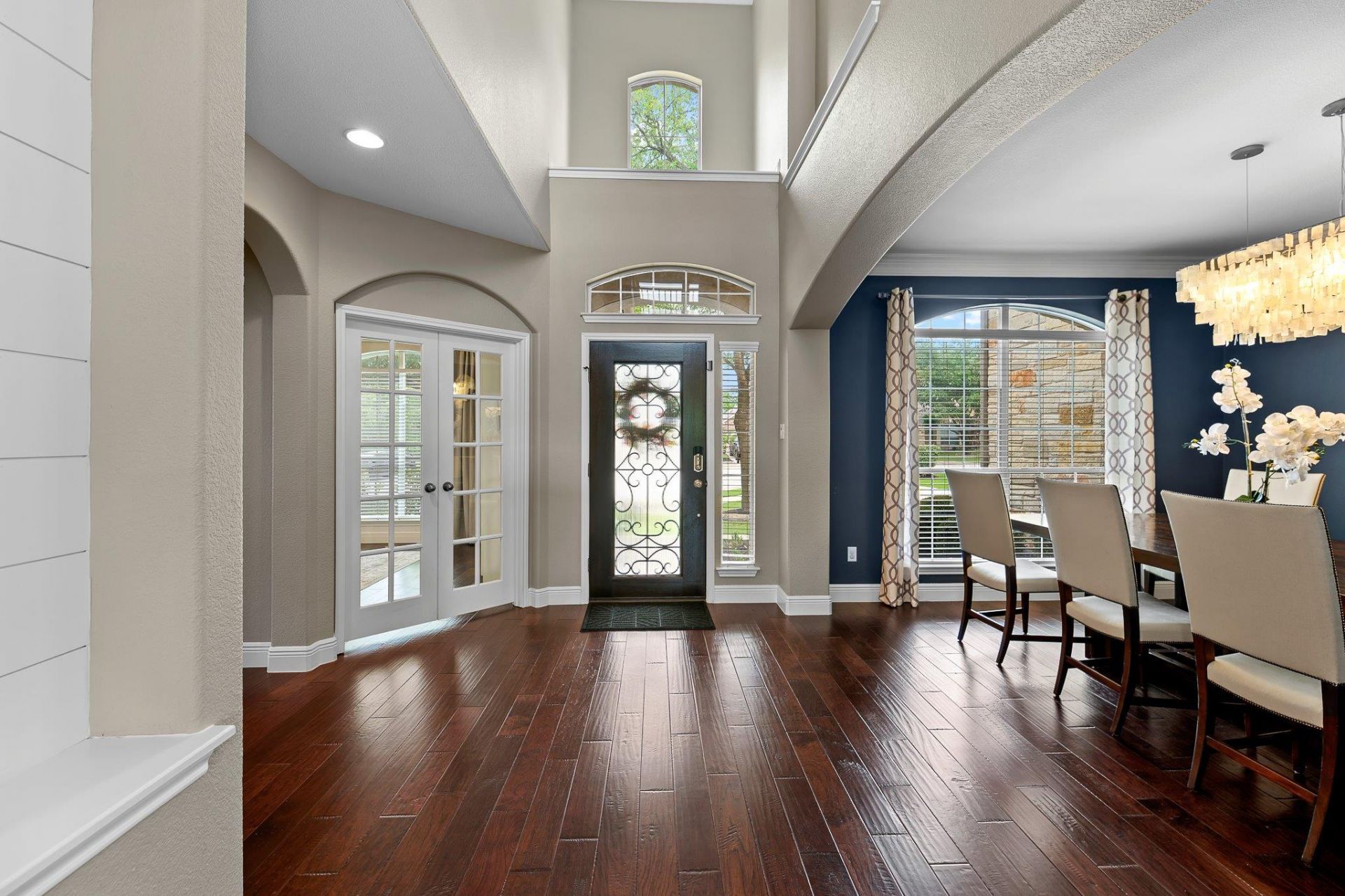 Welcome to this beautifully maintained and thoughtfully upgraded home, offering the perfect combination of style, space, and functionality. From the moment you step inside, youll notice the rich hardwood flooring that flows throughout the first floor, creating a warm and inviting atmosphere. The custom kitchen is a true highlight, featuring abundant raised-panel cabinetry, high-end appliances, and a built-in wine fridge?perfect for both everyday living and entertaining. A spacious laundry room with ample storage adds convenience to your daily routine. The primary suite on the main level is generously sized and includes motorized blackout window shades for added comfort and privacy. Upstairs, a secondary primary suite with its own en-suite full bath provides flexibility for guests or multi-generational living. Youll also find a large office with built-in desks and two walk-in closets, an open loft area, and a fully equipped movie room complete with electric recliners. Storage is abundant in this home with multiple storage closets and attic access. The 3-car tandem garage features epoxy flooring, built-in shelving, and ceiling storage, while the extra-long driveway offers parking for up to 7/8 vehicles. Situated on a quiet cul-de-sac and conveniently located near shopping, dining, and great schools, this home also boasts a private backyard oasis. Enjoy custom landscaping with mature, low-maintenance plants, a large flagstone patio, and a relaxing hot tub?perfect for entertaining or unwinding at the end of the day. Enjoy the neighborhood amenities including a resort style pool, playgrounds, walking trails, amenity center, basketball, pickle ball, and volley ball courts. This home truly has it all ? dont miss your opportunity to make it yours! First floor: Primary suite, bedroom, half bath, living room, formal dining room, eat-in kitchen, laundry roomSecond floor: 3 bedrooms, 2 full baths, three large flex areas (office/loft/movie room)