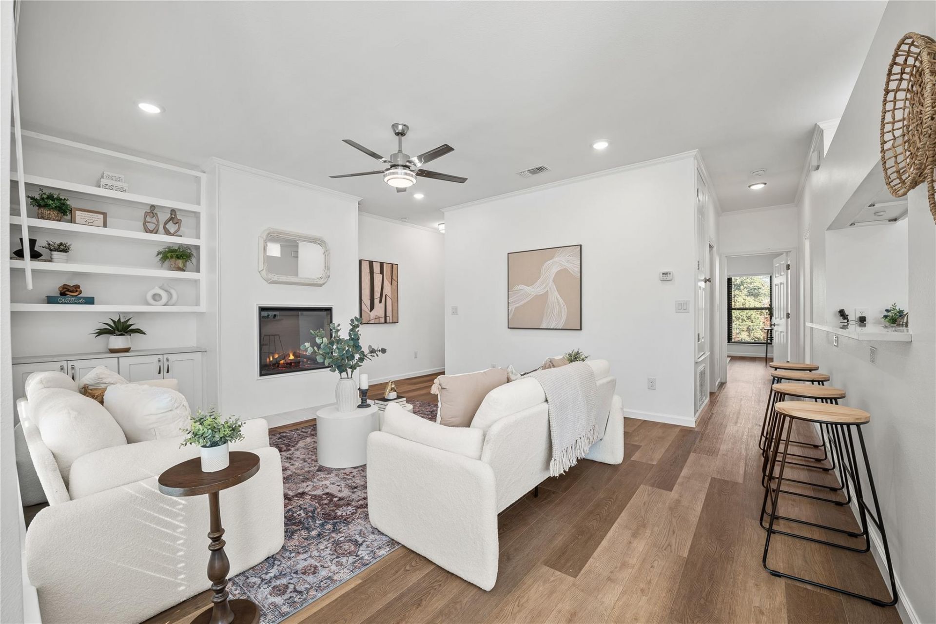 Built in 2022, this 2 bed / 2 bath corner condo in Columbia Square is tucked among mature trees in Northwest Austin, minutes to The Arboretum and The Domain with quick access to 183, MoPac, and 360. Enjoy peaceful, private views from the screened-in back porch, a true year-round outdoor living space. Inside, the layout flows naturally with neutral walls, wood-look vinyl plank flooring, and tile throughout. The living room features an electric fireplace and built-in bookshelves and stays open to the kitchen via a breakfast bar and pass-through cutout. The kitchen offers quartz countertops, stainless steel appliances, and great prep space, while the bright dining area opens directly to the porch. The primary suite is spacious with a walk-in closet and large double vanity. Washer, dryer, and refrigerator are included. Convenient to the CapMetro Pavilion Park & Ride and major corridors for commuting, plus highly regarded schools and everyday essentials nearby. Low-maintenance living in one of Austin's most connected location