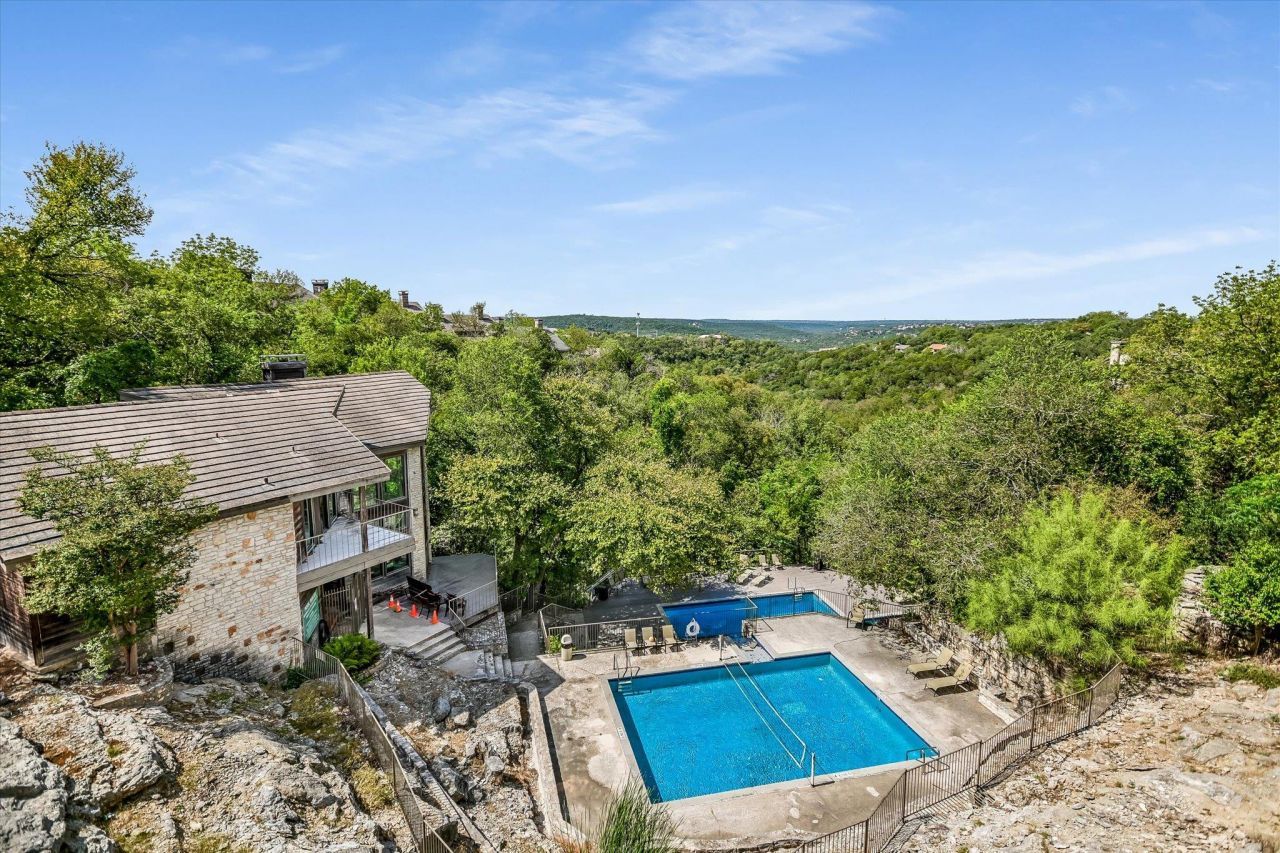 This remodeled condo in Neelys Canyon has the unique advantage of street-level access, it is not a garden sub-level unit. Elevated above the tree canopies, this home maximizes natural light & breathtaking views. Developed by architect Larry Peel, this gem sits inside a rock canyon & enveloped by trees. Positioned on a corner lot with 2 levels, this condo offers panoramic views from its perch high on a hilltop near the edge of an 18-acre canyonland preserve. Enjoy stunning vistas from the expansive private terrace, perfect for entertaining, yoga, or quiet reflection. The community features 2 swimming pools nestled into the canyon, both visible from your balcony. Enjoy incredible sunsets! The terrace is situated inset into the building for optimum privacy & quiet serenity. There is also a neighborhood clubhouse for owners to use. Inside, youll find tall ceilings & hardwood floors. The living room showcases a modern marble fireplace. The kitchen has recent appliances with a charming farm sink & a large walk-in pantry. Storage is plentiful, including a walk-in closet under the stairs. The wood floors continue to the downstairs Primary Suite where youll find a dual vanity bathroom & sizable closet. Floating stairs lead to a second bedroom & adjoining bathroom with a Texas sized closet. Both bedrooms offer flexible options to serve as the primary suite depending on your needs. Neelys Canyon enjoys a prime northwest hills location, surrounded by valuable real estate, with convenient entrances off both Steck Ave & Spicewood Springs. Convenient to Apple, Dell, DT Austin. Just a short drive away are the Arboretum & upscale offerings at the Domain. Experience carefree living with HOA dues that cover water, sewer, trash/recycling/composting services, & pest control. The HOA also manages the pools, exterior maintenance & landscaping. Enjoy the security of a covered carport space & included structure insurance. Plenty of guest parking near the condo.
